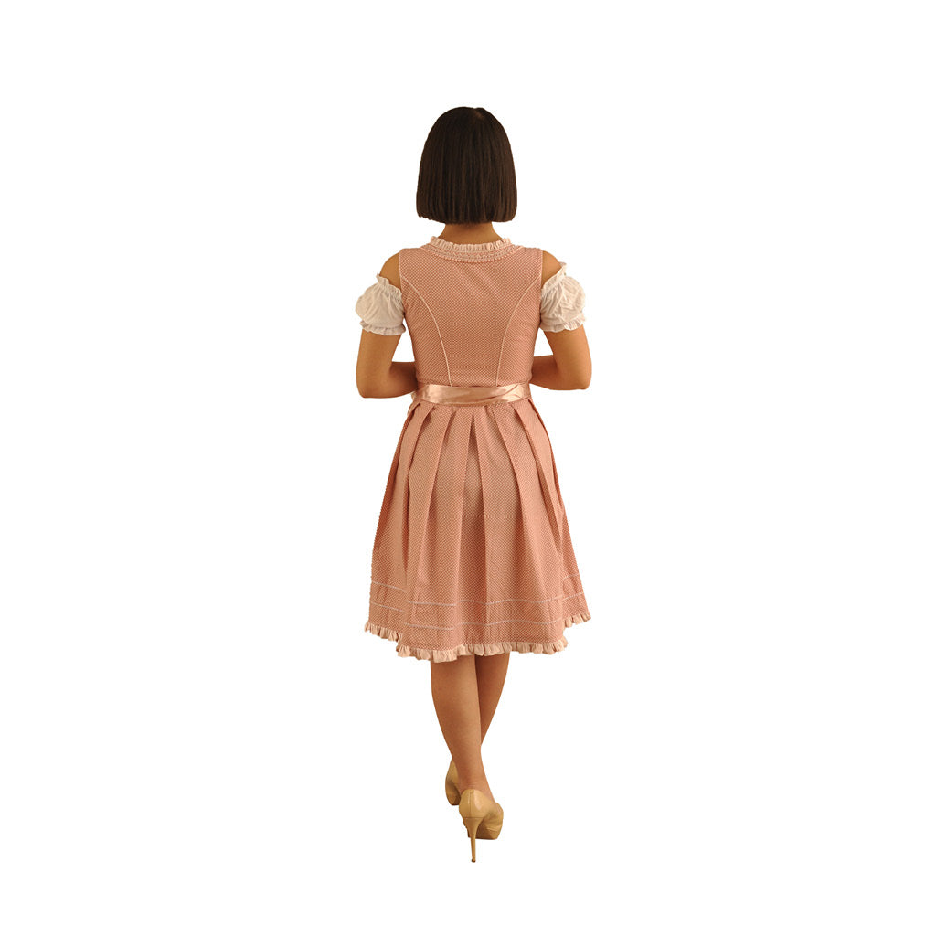 Elegantes Design: Das Dirndl besticht durch seine sanfte Rosafarbe mit feinen Punkten, die eine romantische und zugleich lebendige Ausstrahlung verleihen. Die detailreiche Stickerei und die liebevollen Verzierungen, einschließlich einer wunderschönen Bänderschnürung und aufwändigen Rüschen, machen dieses Kleid zu einem echten Hingucker.